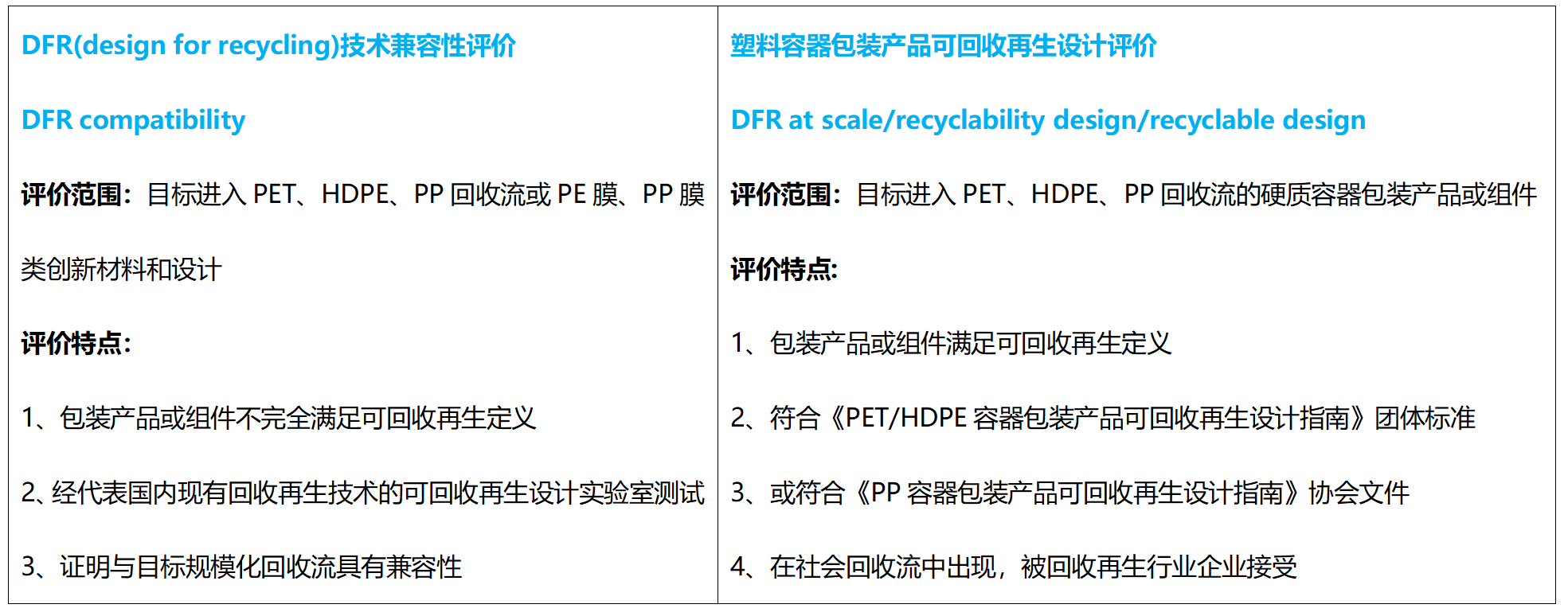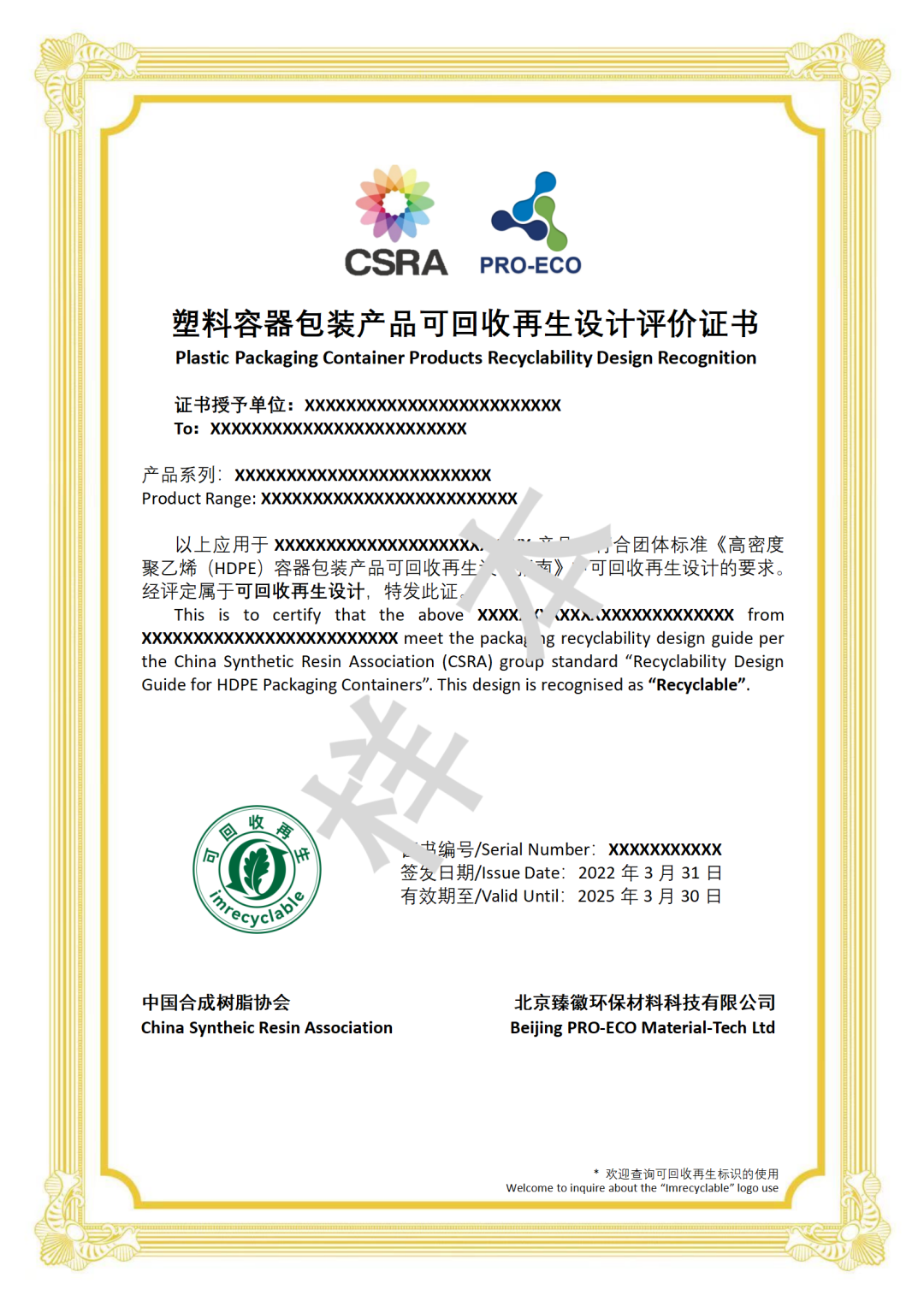 در مارس 2022، انجمن رزین مصنوعی چین استانداردهای "راهنمای طراحی برای بازیافت و بازیافت ظروف پلی اتیلن ترفتالات (PET) و محصولات بسته بندی" و "راهنمای طراحی برای بازیافت و بازیافت ظروف و محصولات بسته بندی پلی اتیلن با چگالی بالا (HDPE)" را ارائه کرد. به طور همزمان "ارزیابی طراحی قابل بازیافت محصولات بسته بندی ظروف پلاستیکی" را منتشر کرد و اولین دسته از موارد طراحی محصول را صادر کرد.