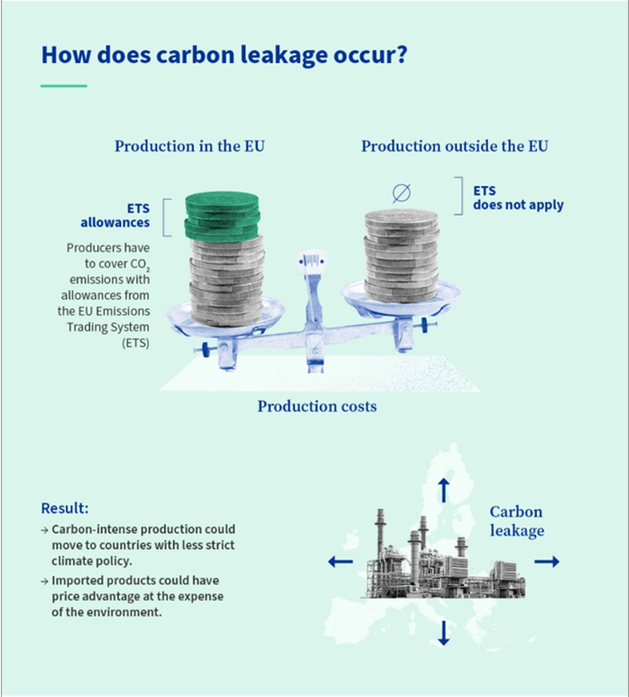 هدف CBAM جلوگیری از "نشت کربن" است، که به این واقعیت اشاره دارد که یک مسیر دقیقتر دو کربنه در یک منطقه منجر به افزایش هزینه کربن در منطقه میشود و شرکتهای تولیدکننده محصولات با کربن بالا را مجبور میکند به سمت مسیرهای کم کربن حرکت کنند. مناطق هزینه کربن، که منجر به انتقال صنعتی می شود. بر اساس نقشه راه کربن دوگانه اتحادیه اروپا، سهمیههای کربن به تدریج تشدید خواهند شد تا زمانی که حذف شوند، و هزینه کربن شرکتها بر همین اساس افزایش مییابد و قیمت محصولات پر کربن نیز افزایش مییابد و در نتیجه بازار محصولات پرکربن را وارد میکند. خارج از اتحادیه اروپا یا انتقال خطوط تولید محصولات با کربن بالا به مناطق کم هزینه کربن خارج از اتحادیه اروپا که به اقتصاد اتحادیه اروپا آسیب می رساند. CBAM به عنوان یک مکانیسم تعادل هزینه کربن داخلی و خارجی، وقوع نشت کربن را تا حدی کاهش می دهد.